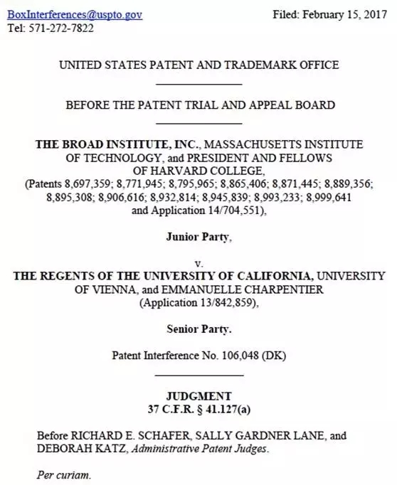 美国专利及商标局对CRISPR专利之争做出的裁决