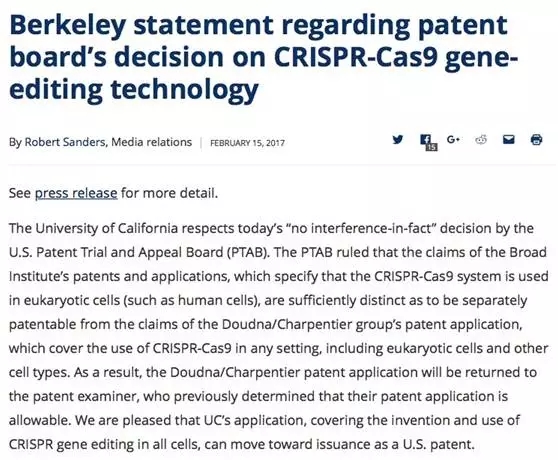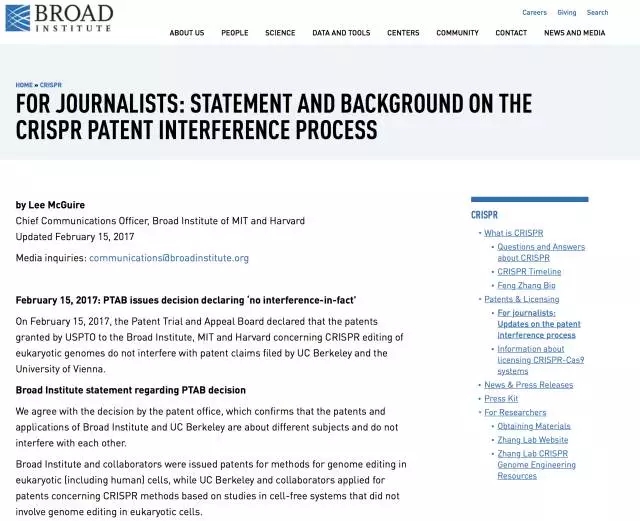 就在同一天,Broad Institute首席通讯官Lee McGuire也在研究所官网上刊发声明,正式对判决结果表态: