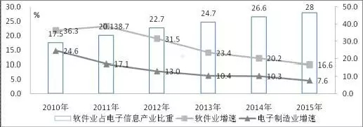 规模以上电子信息产业中,软件和信息技术服务业收入增速快于电子信息制造业9个百分点,软件业比重达到28%,比上年提高1.4个百分点。