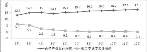 电子测量仪器和电子信息机电行业的内销产值占比高达83.3%和80.3%,电子专用设备、广播电视设备和电子元件行业的内销产值占比达74.6%、65.1%和65%,家用视听设备、通信设备、电子器件和电子计算机行业的内销产值占比为55.5%、52.6%、42.6%和28.1%。此外,内资企业的内销产值占比达81.5%,中小型企业内销产值占比76.9%,对国内市场的依赖度较高;外商投资企业和大型企业内销比例均不同程度提高。