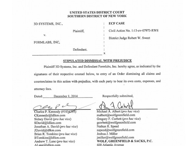 ??????? 已获取SLA技术专利的3DS公司起诉Formlabs以及众筹平台Kickstarter,转眼两年,这个侵权案件终于尘埃落定。今年,3DS公司表示停止诉讼与Formlabs进行谈判,近日,3DS公司宣布撤诉。在3D打印行业发展伊始阶段,3D打印业界存在知识产权、技术专利等方面的分歧。这时,建立法律规范将会有助于3D打印行业的发展。