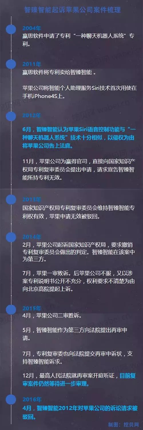 这场智臻智能与苹果公司的专利纠纷在2013年、2014年共开庭审理过4次。苹果公司认为智臻智能的“一种聊天机器人系统”发明专利复审无效,并因此起诉支持智臻智能“专利有效”的国家知识产权局。
