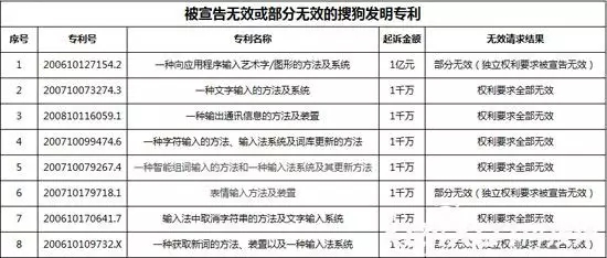 经国家知识产权局专利复审委员会合议判定,搜狗2015年起诉百度的17项专利中,除去尚未公布结果的3项以外,被宣告无效或部分无效的专利数量多达8个。这意味着这些专利的技术方案属于或大部分属于现有技术,已不适合行使其专利权。搜狗“被无效”的专利当中,也包括标的一亿赔偿天价的 “一种向应用程序输入艺术字/图形的方法及系统”(专利号为200610127154.2)的专利,此专利的23项权利要求当中,17项被宣告无效,这其中包括所有的独立权利要求。