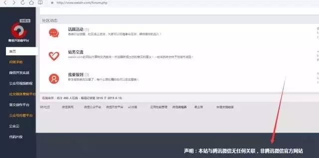 ?????? 目前,weixin.com被用于一个名叫“微信开发者平台”的BBS社区类项目,其首页确有声明“本站与腾讯微信无任何关联,非腾讯微信官方网站”,但是,用户难免可能产生混淆。?