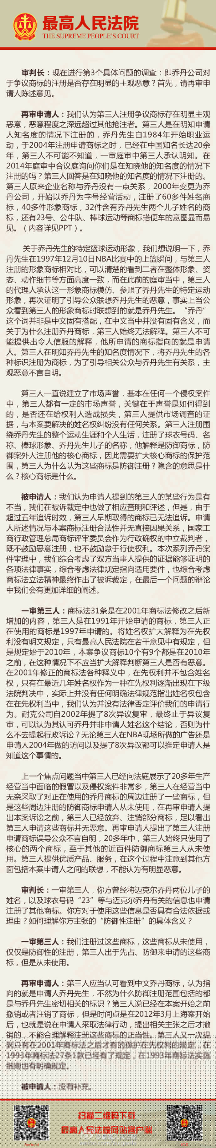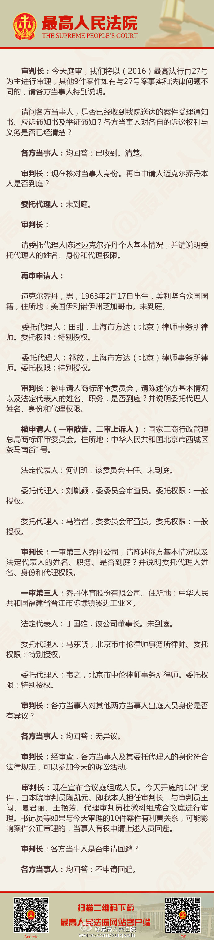 迈克尔?乔丹不服,向最高人民法院申请再审。2015年12月,最高人民法院以迈克尔?乔丹的再审申请符合《中华人民共和国行政诉讼法》第九十一条第(六)项规定的情形为由(二审判决遗漏迈克尔?乔丹有关2001年修正的商标法第三十一条的上诉理由),裁定提审10件案件。