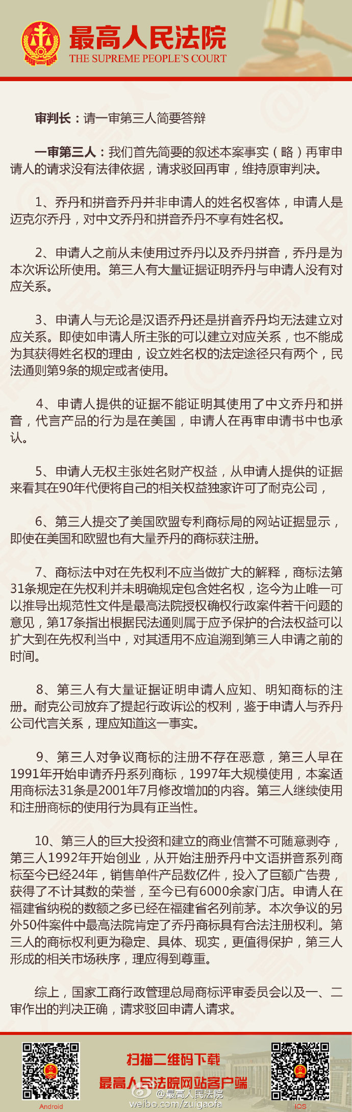 第一点意见是,第三人依法申请、注册乔丹、拼音乔丹商标,并没有损害申请人的姓名权。