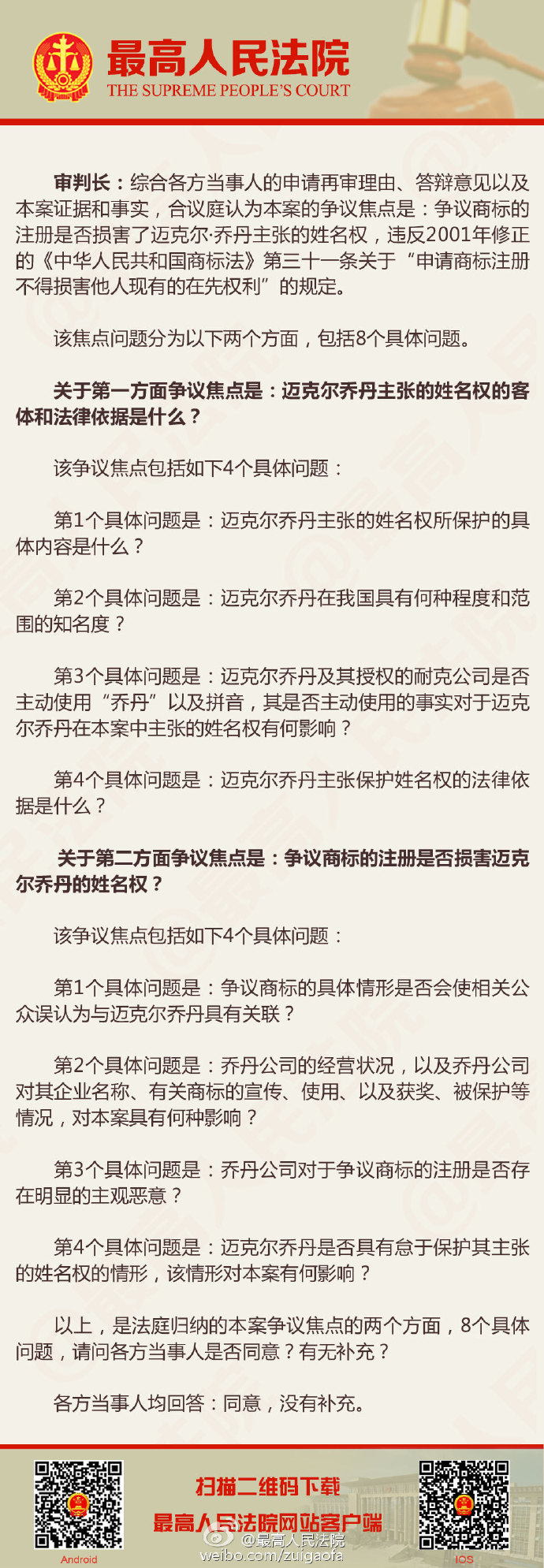 更多 >>此前,最高人民法院已于4月19日对乔丹系列案件进行了第一次公开开庭审理,组织各方当事人交换证据并对新证据进行了质证,初步归纳了本案的争议焦点。