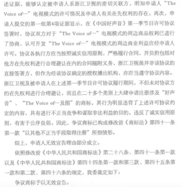 在包括“蓝巨星好声音”等在内的26个商标被宣告无效的这一批裁决书中,作为前四季《中国好声音》播出平台的浙江卫视一并被指违约,商标评审委员会认定:蓝巨星国际传媒的行为明显违背了《中国好声音》授权许可协议约定的内容,“具有进行不正当竞争和牟取非法利益的目的,违反了诚实信用原则,有害于公序良俗”。