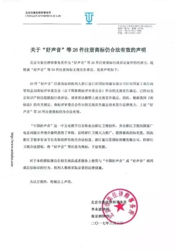 针对这一判定,浙江蓝巨星国际传媒有限公司委托律师发表郑重声明:已向北京知识产权法院提起行政诉讼,“好声音”等26件注册商标仍合法有效。?