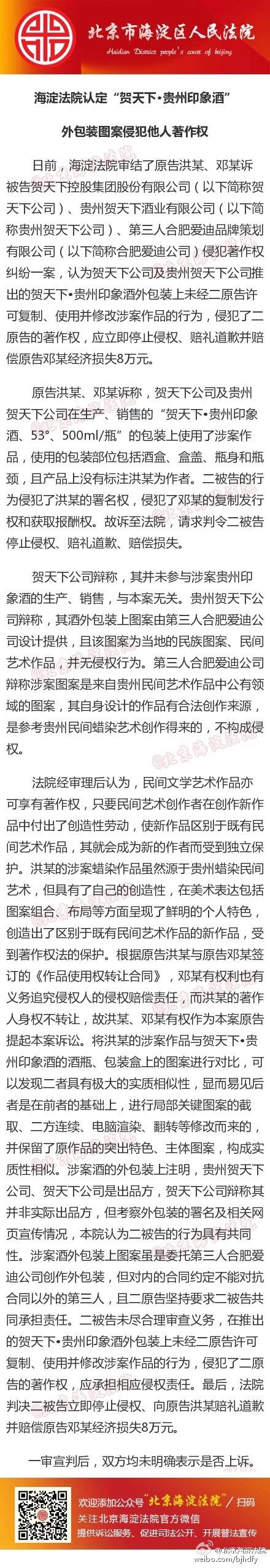 海淀法院认定“贺天下·贵州印象酒”外包装图案侵犯他人著作权