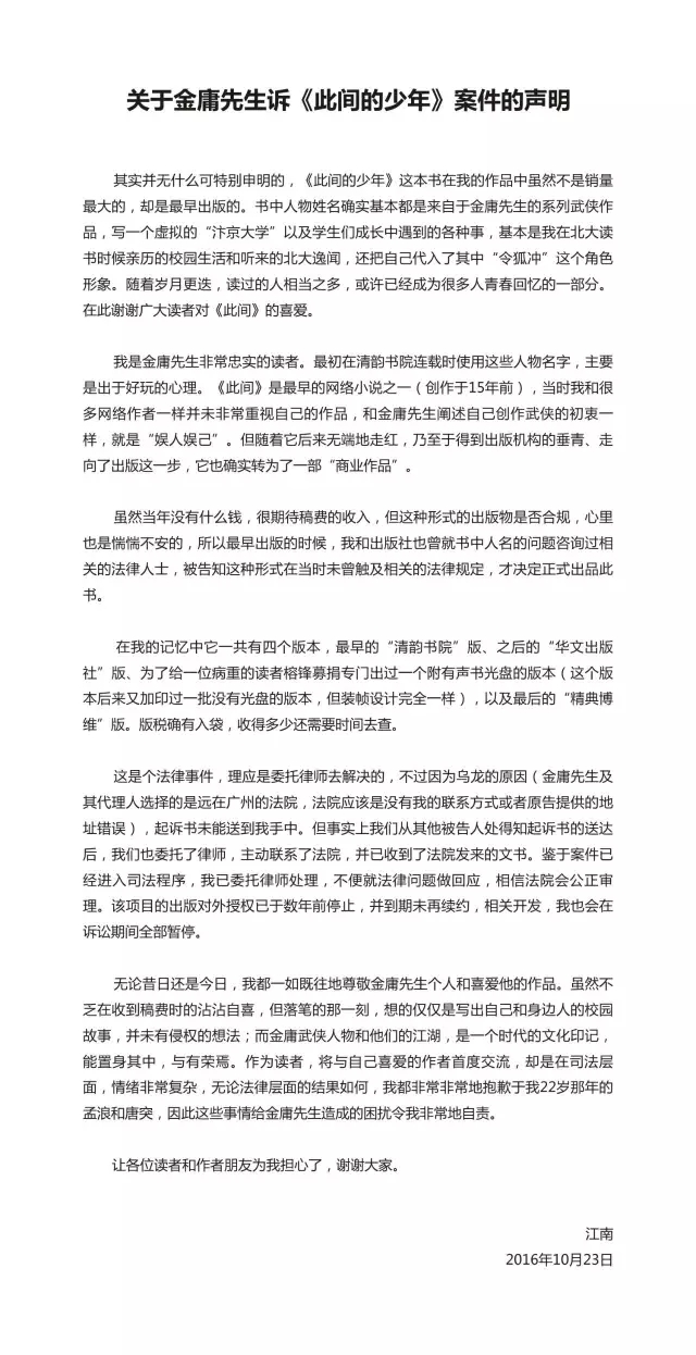 10月23日晚间,@江南 在新浪微博中作出一份言辞恳切的回应声明。江南表示自己是金庸的忠实读者,陈述了涉案作品《此间的少年》的创作,“书中人物姓名确实基本都是来自于金庸先生的系列武侠作品”,当年落笔时并未有侵权想法。而从网络同人小说“无端走红”到成为商业作品,江南表示出版前“曾就书中人名的问题咨询过相关的法律人士,被告知这种形式在当时未曾触及相关的法律规定,才决定正式出品此书”。江南还当初还简述了《此间的少年》的出版、授权情况,该书出版对外授权已于数年前停止,到期未再续约。江南表示“无论法律层面的结果如何,非常非常地抱歉于我22岁那年的孟浪与唐突,因此这些事情给金庸先生造成的困扰令我非常地自责”。