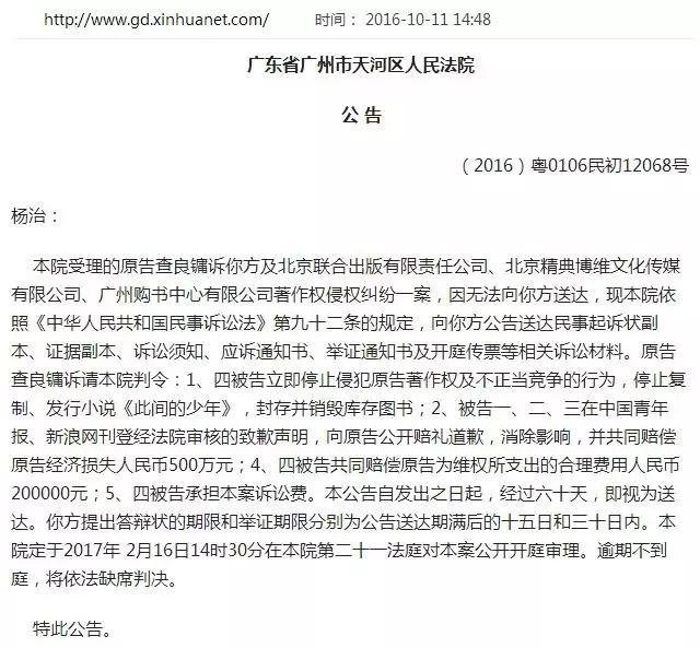 广州天河区人民法院的一则公告显示,金庸先生(原名查良镛)起诉了包括江南(原名杨治)在内的四个主体,理由是著作权及不正当竞争,要求江南方面停止复制、发行小说《此间的少年》,封存并销毁库存图书;在中国青年报、新浪网刊登经法院审核的致歉声明;赔偿经济损失500万元及合理费用20万元。该案将于2017年2月16日在广州市天河区人民法院公开开庭审理。