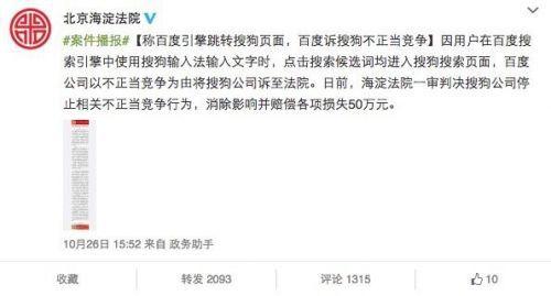 更多 >>??????? 10月27日消息,北京海淀法院在官方微博中公布了近日审理的一起案件:用户在百度搜索引擎中使用搜狗输入法输入文字时,点击搜索候选词均进入搜狗搜索页面,百度以不正当竞争为由起诉搜狗,海淀法院一审判决搜狗输入法停止相关不正当竞争行为,消除影响并赔偿各项损失50万元。