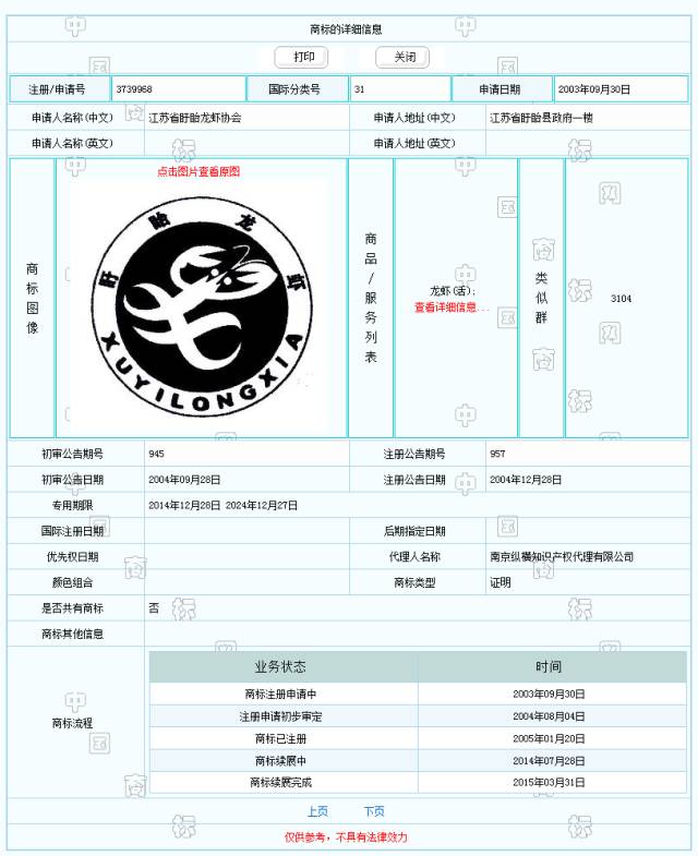 首例“盱眙龙虾”侵权案的被告为南京鼓楼区顾某小吃店,店堂挂了“盱眙龙虾”铜牌经营,庭审中店方很委屈,表示不知道自己卖个小龙虾还侵犯了盱眙龙虾协会的注册商标权。