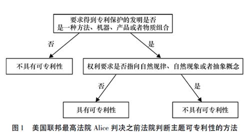 传统上,美国法院通过图1所示步骤进行主题可专利性判断[20]。一项发明只有在既属于专利法第101条规定的四大类法定可专利主题,同时又没有指向自然规律、自然现象或者抽象概念的情况下,才能满足主题可专利性条件。然而,正如Lourie法官所指出,由于对一项权利要求是否指向自然规律、自然现象或者抽象概念的判断缺乏系统性、客观性和统一性,实际上上述分析方法在实践中难以适用[21]。