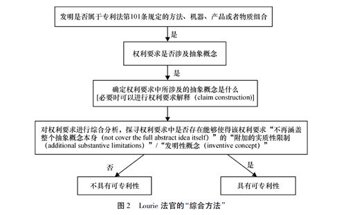 Lourie法官通过对美国联邦最高法院的5个典型先例判决[22]进行分析,总结出联邦最高法院的一贯主旨,并在此基础上提出一个新的“综合方法”(见图2),用以判断利用计算机实施的发明的可专利性[23]。根据上述“综合方法”,Lourie法官认为涉案方法权利要求、计算机系统权利要求以及媒介权利要求均不满足主题可专利性条件,因而应当判为无效[24]。