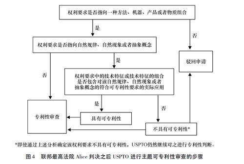 依据《基于Alice判决的初步审查指南》,USPTO依图4所列步骤对主题可专利性进行审查。该指南对涉及抽象概念的权利要求的审查采用二步分析法。第一步判断权利要求是否指向抽象概念。如果一项权利要求包含抽象概念,则进入第二步分析:判断该权利要求中是否存在其他限制特征,并且这些限制特征对该抽象概念进行了符合可专利性要求的实际应用[69]。为了指导审查员的具体判断,该指南对联邦最高法院Alice判决中例举的涉及抽象概念的情形进行了概括总结,并对涉及抽象概念的权利要求中,技术特征能够使该权利要求具有可专利性和无法使该权利要求具有可专利性的情形进行了分类总结[70]。经过第二步分析,如果确定涉及抽象概念的权利要求中没有能够赋予该权利要求可专利性的技术特征,则该权利要求将被以指向“非法定可专利主题”为由依据专利法第101条予以驳回[71]。