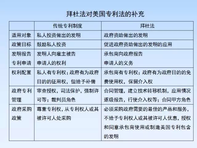 在拜杜法等法规中还规定其它一系列政策,包括:政府获得特殊发明的专利权;政府有权要求承包商、其被许可人或受让人,定期报告其如何应用发明的情况;政府机构拥有介入权;美国工业优先获得专利许可等。这些专利政策极大地丰富了专利制度的内容,使专利制度的适用范围由原来的以私人投资为主、提供“私人物品”的市场经济领域,进一步扩展到了以政府投资为主、提供“公共物品”的指令经济领域。