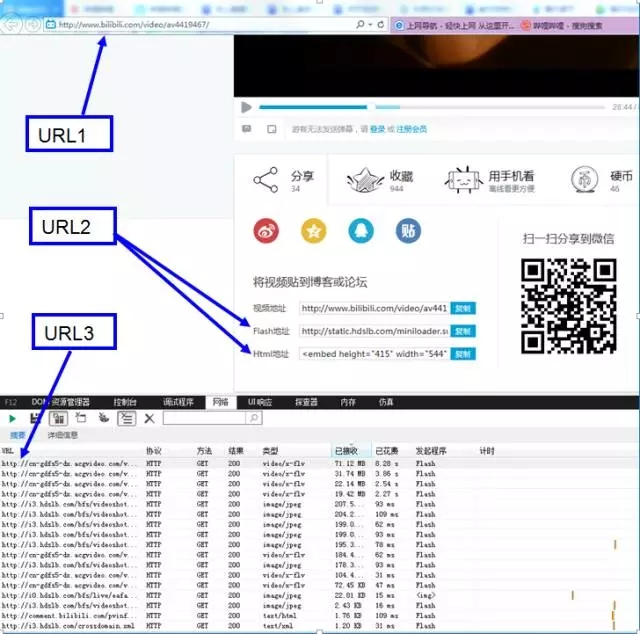 在播放影片的过程中,打开IE浏览器自带的开发人员工具(F12),通过“网络”栏目下的“启用网络流量捕获”功能,可以获得该影片视频文件的大小、文件类型及文件来源地址(即图一中的URL3)等信息,这个文件来源地址就是储存视频文件的URL地址。由于视频文件的版权成本较高,视频网站往往将视频文件存储在外部无法公开检索的服务器中。该URL的完整地址为: