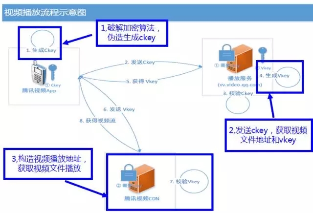 由于影视内容的版权成本高,相应的服务器和运营成本也较高,视频网站往往会对其服务器中的视频文件采取相应的技术?;ご胧?#xff0c;以限制外部网站轻易获得视频文件。视频网站采取的技术?;ご胧?#xff0c;主要是依据请求端(包括视频网站、客户端)和服务器端设计好的加密算法,在请求端点击视频播放功能后,播放服务程序会生成视频地址鉴真密钥ckey加密字串,嵌入到HTTP请求中。播放服务器接收到这个HTTP请求后,根据特定的解密算法,解密该ckey,并返回嵌入视频播放密钥vkey值的相应剧集播放地址,视频得以正确播放。视频文件存储在视频网站CDN服务器中,该文件地址外部网站(如搜索引擎)通过一般途径无法检索,只有提供ckey通过验证才能获取。ckey是最关键的验证部分,破解了ckey,就能够结合影片信息及相应参数获得vkey和视频文件地址。