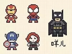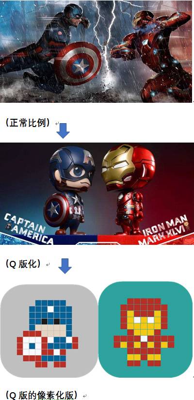在实践中,像素化往往喜欢和Q版合并使用,比如下面美国队长和钢铁侠: