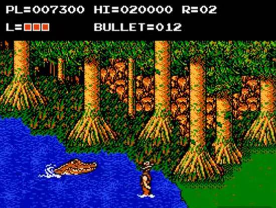 (游戏《鳄鱼先生(マッド?シティ)》中的画面,恰好由于技术所限,游戏人物的除了草帽、马甲和刀之外的特征,都很模糊,无法与Hogan对应,即也是使用了“鳄鱼邓迪”的角色要素)