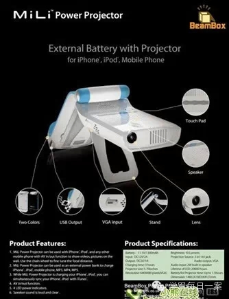 ??????? 除上述图片外,该文件同时以文字披露下列产品信息:产品品牌名为MiLi。产品名称为MiLi Power Pico Projector。产品型号为H[size=+0]I-P60。产品规格为:电池11.1V/1200mAh,输入DC14V/2A,输出DC5V/1A,充电时间3小时。信号来源:在iPhone、iPod、MP4功能、影碟、机顶盒、笔记本电脑;音频输出VGA(像素)插孔,音频输入2W的内置扬声器。产品特点为:采用先进的LCOS(液晶附硅)技术,创新的微型投影技术;AV(音频/视频)输入、VGA(像素)输入和RCA(莲花插座)输入随意切换;集成扬声器,高品质音频输出,触摸屏控制音量;充电电池组,可更换,看电影不必担心电量不够;同步和充电,使用标准迷你USB电缆充电和同步你的iPhone/iPod;专业兼容性,可兼容iPhone和iPod,VGA(像素)端口来源和RCA(莲花插座)来源。?