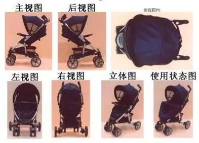 在第27377号无效宣告请求审查决定中,专利复审委员会认为,苏州威凯公司专利与涉案专利之间的区别在于:(1)苏州威凯公司专利前轮为一个组合轮,后轮为两个单轮,整体构成了三轮推车的结构;涉案专利前轮为两个组合轮,后轮为两个单轮,整体构成了四轮车的结构。(2)苏州威凯公司专利的轮毂为三条筋;涉案专利为五条筋。(3)苏州威凯公司专利的置物篮为长方体,紧贴座椅的正下方;涉案专利为楔形,置于车轮支架上。(4)从推车正面看,苏州威凯公司专利的两推杆架之间在前轮上方设有一横梁;涉案专利在前轮上方形成弧形。(5)苏州威凯公司专利的遮阳罩两侧设有细长条状网眼;涉案专利设有扇形网眼。