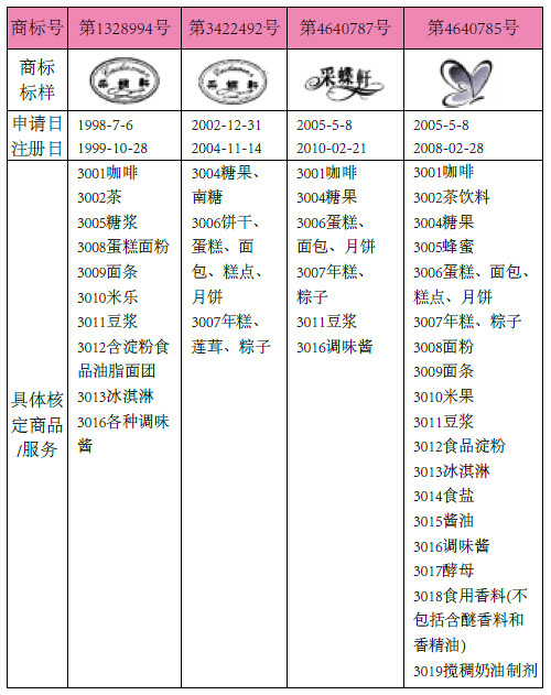 2003年9月14日,卢某、梁某从中山市石岐区宏基食品厂受让第1328994号与第1344787号“采蝶轩CAIDIEXUAN及图”商标。记者了解到,卢某、梁某目前在蛋糕、面包等商品和咖啡馆、餐馆等服务上已注册“采蝶轩”图文、“CAIDIEXUAN CATE”文字等数件商标,并许可给中山采蝶轩公司使用。