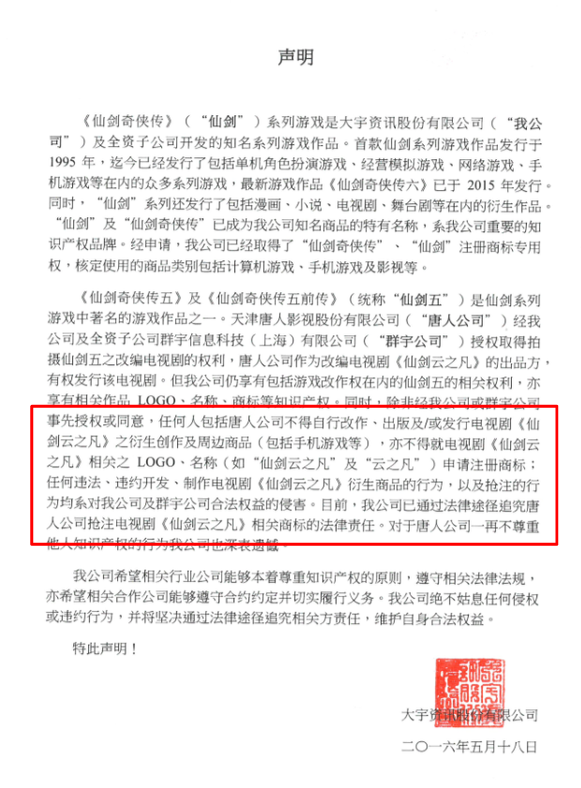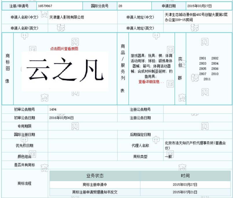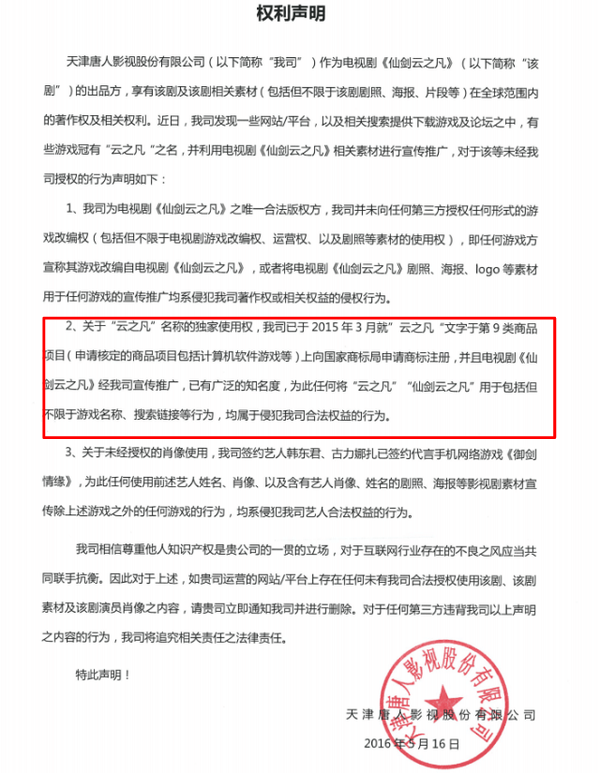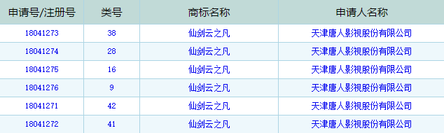 5月16日,唐人影视曾发布声明称,该公司已于2015年3月在第9类商品上(其核定项目包括计算机软件等)申请“云之凡”文字商标,任何将“云之凡”、“仙剑云之凡”用于包括但不限于游戏名称、搜索链接等行为,均构成侵权。