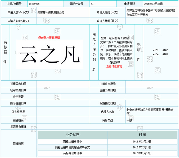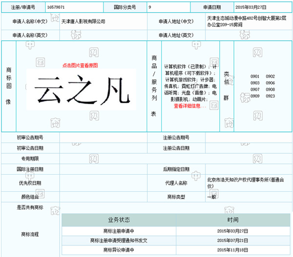 唐人影视在第9类科学仪器等商品类别上申请的第16579871号“云之凡”商标,申请日期为2015年3月27日,目前商标状态为“商标异议申请中”。