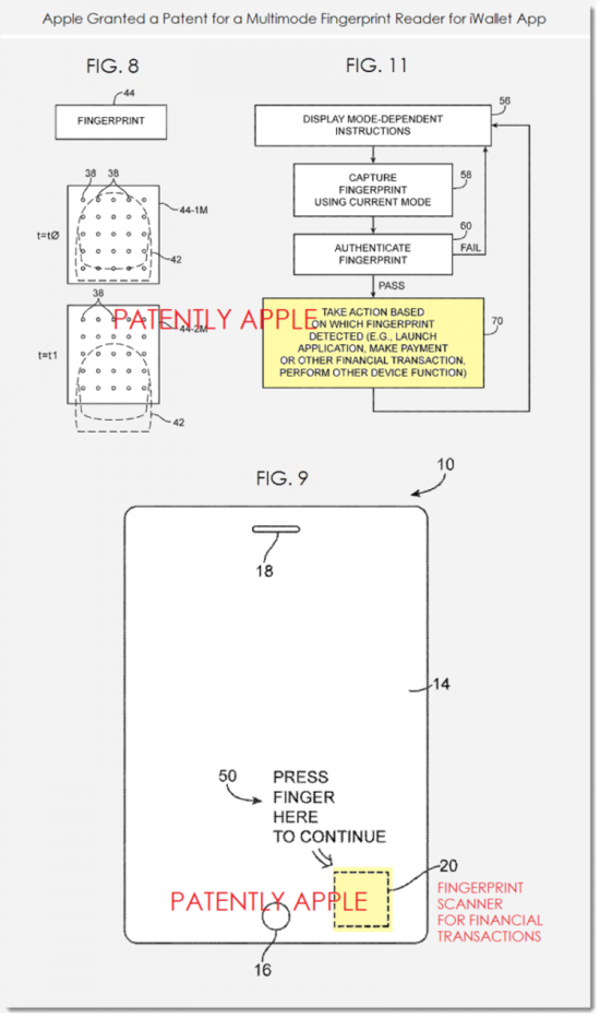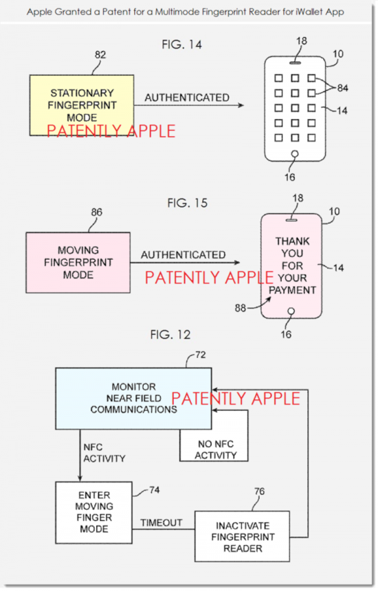 ??????? 美国专利商标局日前公开了苹果获得的多项专利,涉及多模式指纹扫描器。其中一项与目前 iPhone Home 键上的指纹传感器相关,苹果称之为“稳 定”模式扫描器,另外一项则是“移动模式”扫描器,主要用于金融交易之中。苹果在专利文件中还表示,他们的金融系统部件将支持 NFC。?