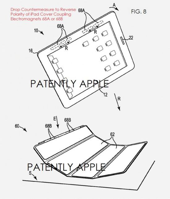 ??????? 根据专利文件显示,这一技术主要依托磁铁和传感器。苹果在专利文档中以iPad平板为实例,描述了一款内置了运动传感器的保护壳,当设备掉落时它可以耦合到致动构件,通过启动致动器来改变受影响的几何形状。简单的说,假设iPad Smart Case 或者Smart Cover 正处于翻开贴于磁铁背面的情况,那么当设备掉落时它可以快速使用其磁铁端来保护设备的摔落面。?
