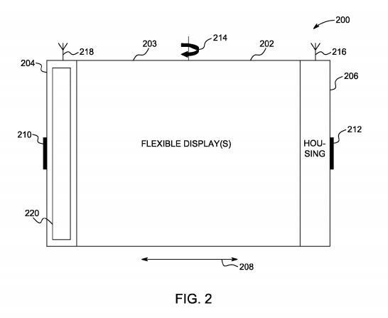 ??????? 苹果的这项专利描述了一种“拥有自适应柔性显示屏的移动电子设备”,并介绍了该技术的几种不同应用方式,范围包括个人使用和“数字期刊广告”。?