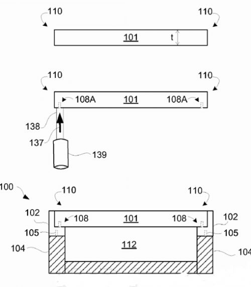 ??????? 专利显示,苹果实施的方法之一就是采用激光消融技术,在厚度0.3-1.0毫米的蓝宝石薄片上蚀刻出楔形凹槽,同时用射流冷却材料,顺便带走融化的陶瓷。?