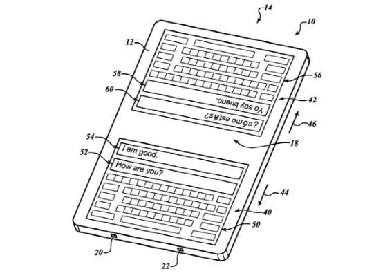 ??????? 从曝光的专利当中可以看出,谷歌的这款应用共有两个相对的虚拟键盘区域。当你在一边以自己的语言输入想说的话时,这些文字会被立刻翻译成另一种语言显示在对面。?