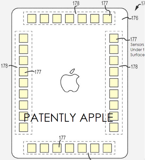 ??????? 今天苹果又获得了一项与iPad 虚拟游戏控制相关的专利。在这项专利中,苹果介绍将传感器整合到机身背部,让游戏玩家获得与标准手柄功能相同的控制器输入体验。这些传感器可能以网格状线性方式排列,或者是其他适合的方式和/或密度排列,以获得最理想的输入间隔距离和/或功能。?