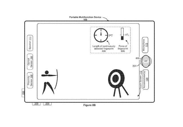 ??????? 苹果对这项专利能够实现的功能做了十分详尽的描述,包括根据指纹运动变化锁定屏幕方向、在多任务应用之间进行导航,以及在射击游戏中通过home按键瞄准目标——这样就能避免进行触控操作时视野被遮挡的问题。?