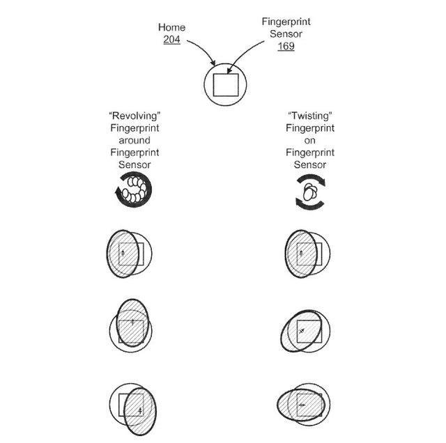 ??????? 这项专利相当于让touch id指纹传感器发挥类似触控板的功能:用户只要在home按键上动动手指,就能进行翻阅文档、向下滚动查看网页、翻看相册中的照片等操作。此外,专利中还列出了指纹的扭转和旋转等手势,以及在touch id上施加的不同力度——这些操作可以用来执行不同任务。?