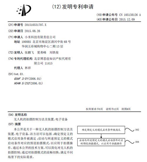 其实过去几个月网上曾不断传出小米将会进军无人机领域的传闻,虽然官方一直对此不置可否,但据中国知识产权局最近公开的专利文件显示,原来小米于今年8月26日申请了一项《无人机的拍摄控制方法及装备、电子设备》的专利。当中可以看到该款小米无人机将会采用4轴设计,而为了减少用家只能专注于飞行控制的缺点,所以更特别应用到小米手环去进行手势操作,比如用家可以用手势做出轨迹图形,接着无人机便会根据相关轨迹飞行,例如无人机能以使用者作为中心进行环绕飞行,并将镜头对准使用者进行拍摄。