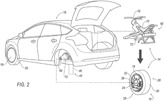 这是福特公司于2014年6月递交的一份专利申请,已被美国专利商标局于12月15日批准。根据上面草图看,福特认为可以利用拆卸下来的汽车轮胎,拼装成为一辆随车携带,并由电力驱动的单轮摩托。