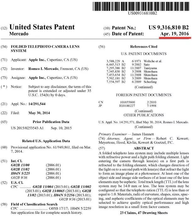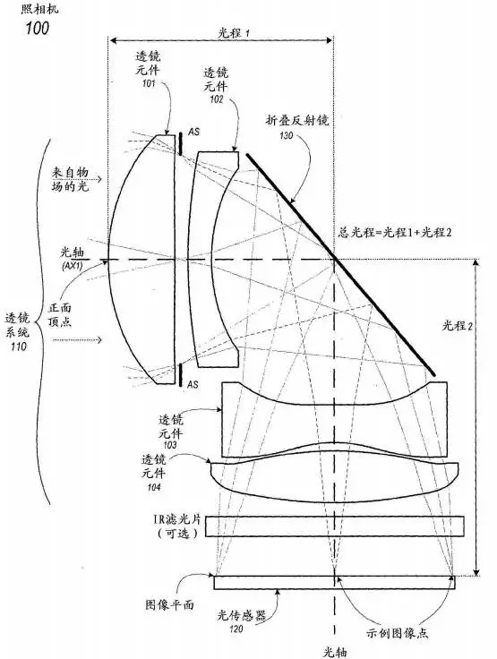 根据专利文件中公布的具体细节,照相机包括光电传感器和紧凑的折叠式摄远透镜系统,折叠照相机透镜系统的光路可以有利于对于照相机透镜组件实现小形状因数,并且可以也有利于实现使用相对小数目的透镜元件的小形状因数的高分辨率光学透镜系统。