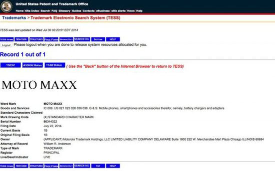 ??????? 摩托罗拉日前获得 Moto Maxx 商标专利,这一商标名字预计会在新款智能手机上使用。有分析认为 Moto Maxx 主要是与电池相关,也就是说 Moto Maxx 将配备一块超大电池。目前 Moto 产品线有 Moto X、Moto G 以及 Moto E,未来可能会迎来 Moto Maxx。