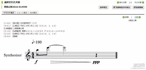 申请的相关情报已经于3月22日在专利情报平台上公开。从菜单的“商标”一栏选择“商标番号照会”然后在“出愿番号”一栏输入“2016-014590”即可浏览申请内容。其中文献部分为金币音效的乐谱,点击上方的“音声再生”按钮就可以听到音效。