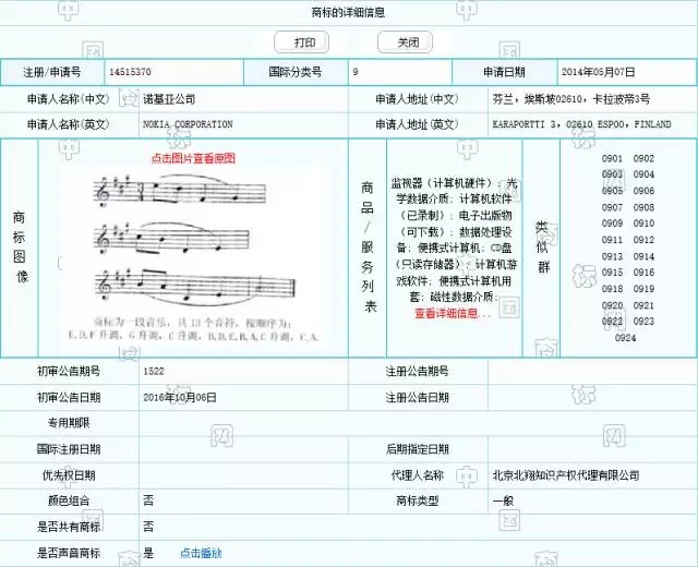 在中国商标网近期公布的商标公告中,诺基亚公司申请的第9类第14515370号声音商标已于2016年10月6日初审公告。