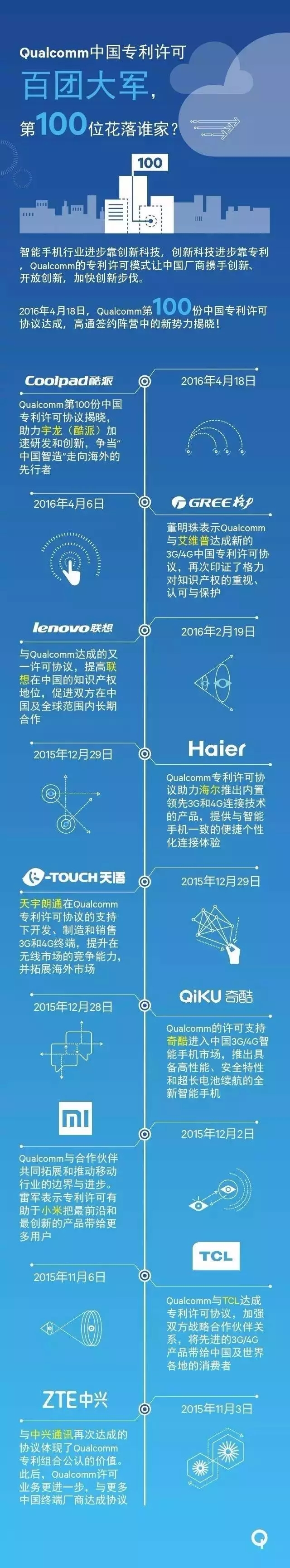 在本周与中国手机厂商宇龙(酷派)签订专利许可协议之后,高通声称与中国企业签订的专利许可协议已经达100份,那么海信就是第101份了,啧啧!