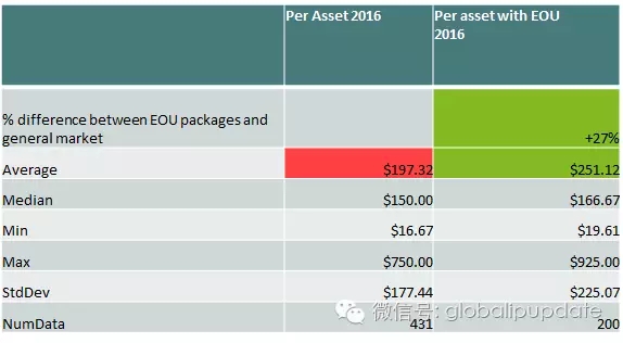如果出售的专利中附带有EoU (evidence of use),价格比平均价格高出27%;