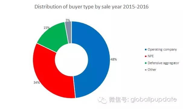 NPE购买的比例由42%下降到34%(显示出2016年美国专利运用enforcement环境比往年要艰难一些);