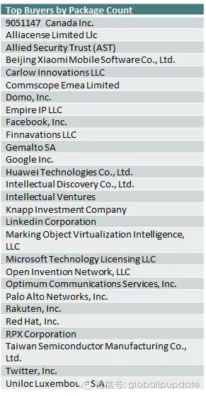 在购买专利者排名中,中国的小米和华为榜上有名,分别列第4和第13位。