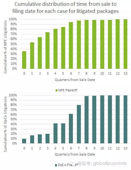 在被用于诉讼的专利中,如果是NPE购买,则有一半是在收购后的6个月之内就被用于诉讼;